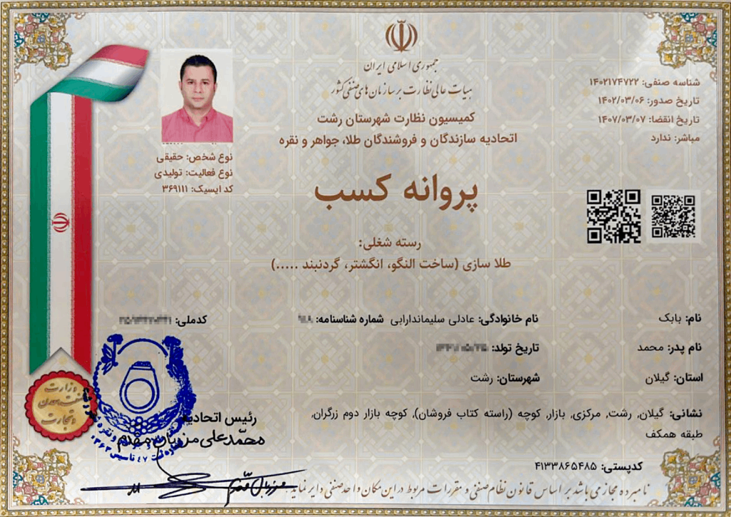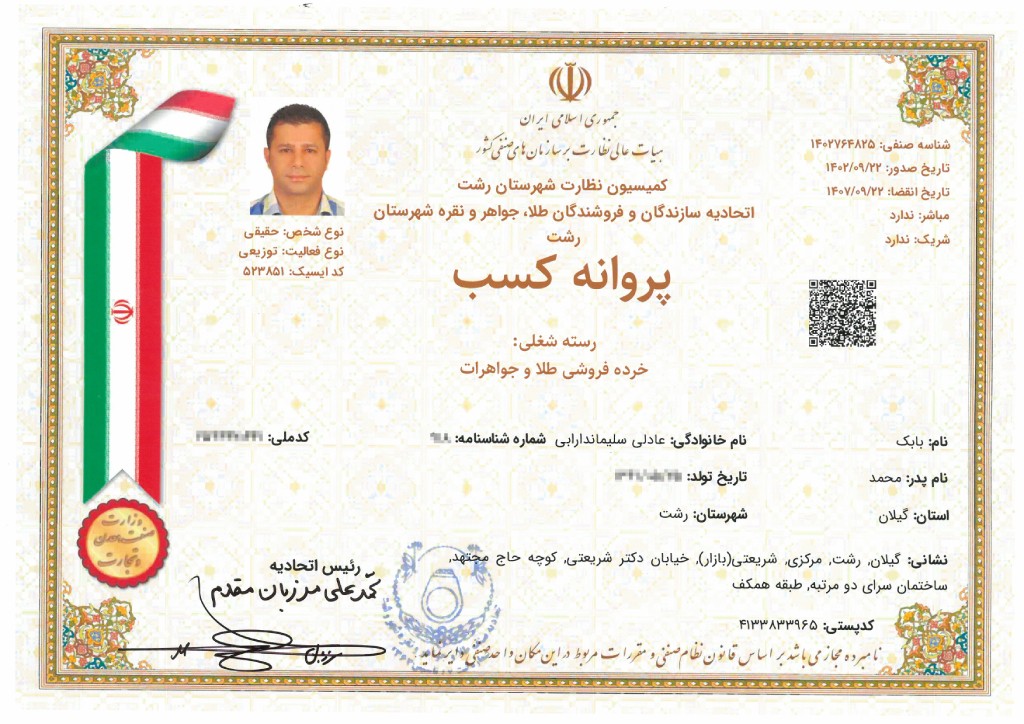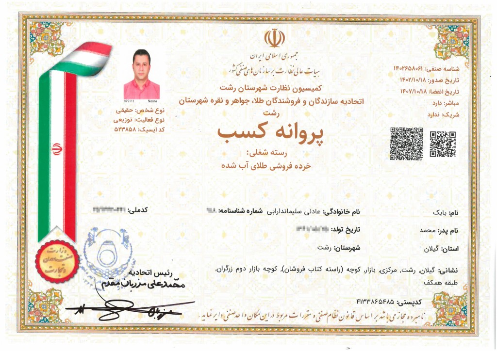 پروانه کسب خردهفروشی طلا و جواهرات از اتحادیه طلا و جواهر شهرستان رشت