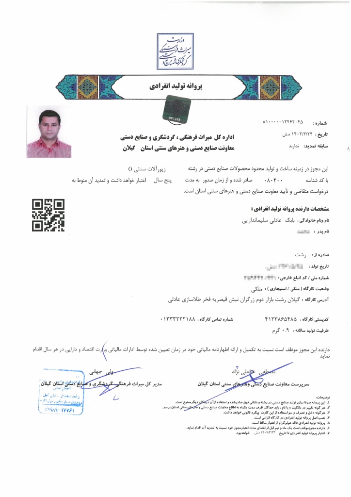 پروانه تولید انفرادی از اداره کل میراث فرهنگی، گردشگری و صنایع دستی استان گیلان
